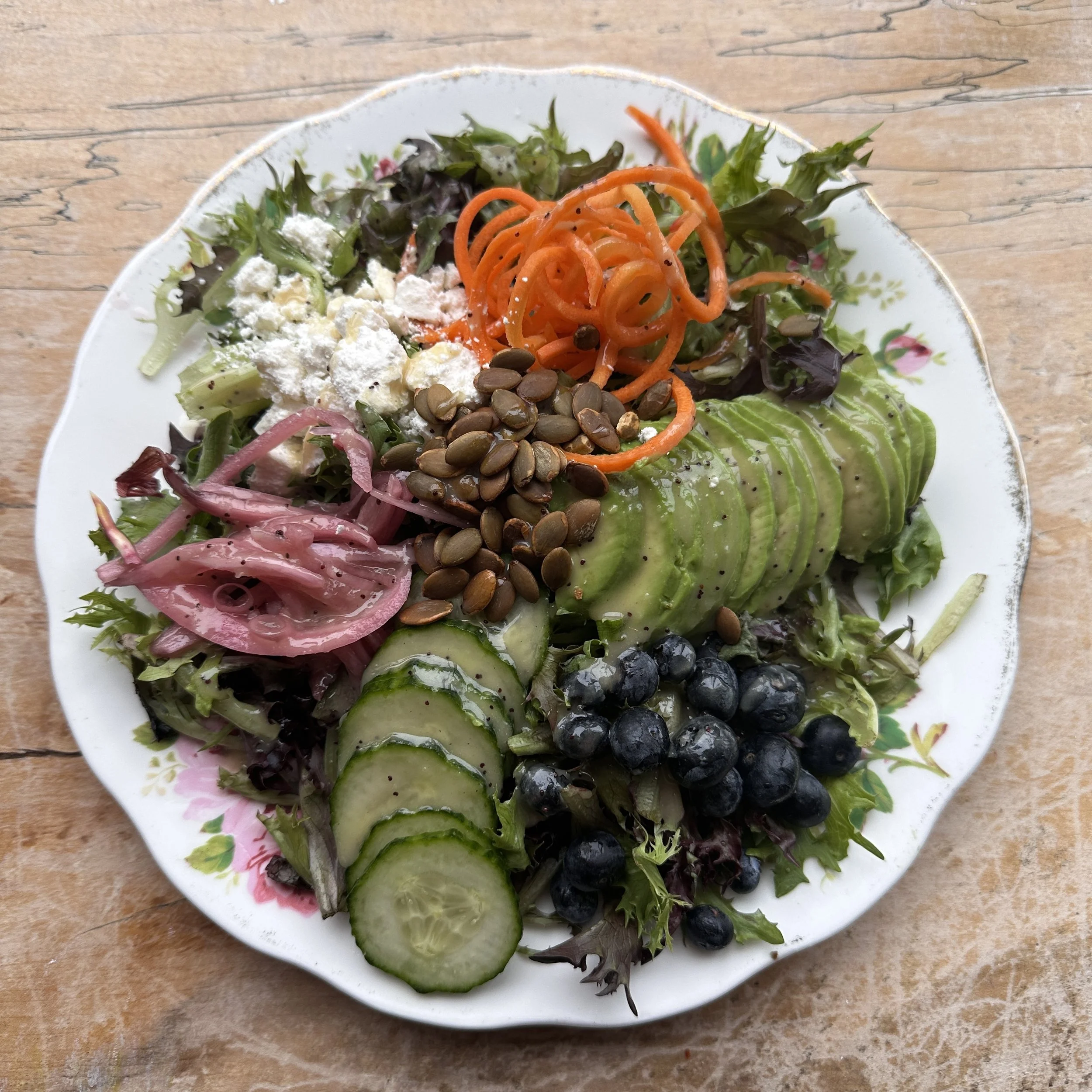 Local spring mix, avocado, pickled onion, cucumber, carrots, blueberries, feta, pumpkin seeds, lemon poppyseed dressing.